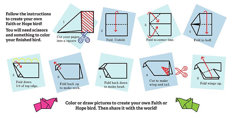 The origami craft page can be used to create your own Faith or Hope bird by coloring or drawing pictures on it.